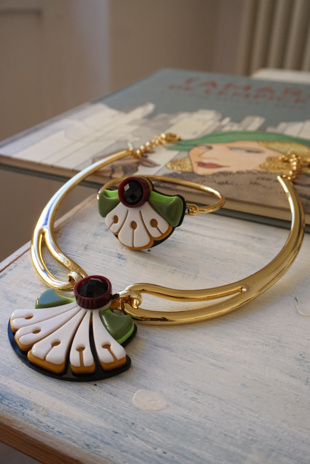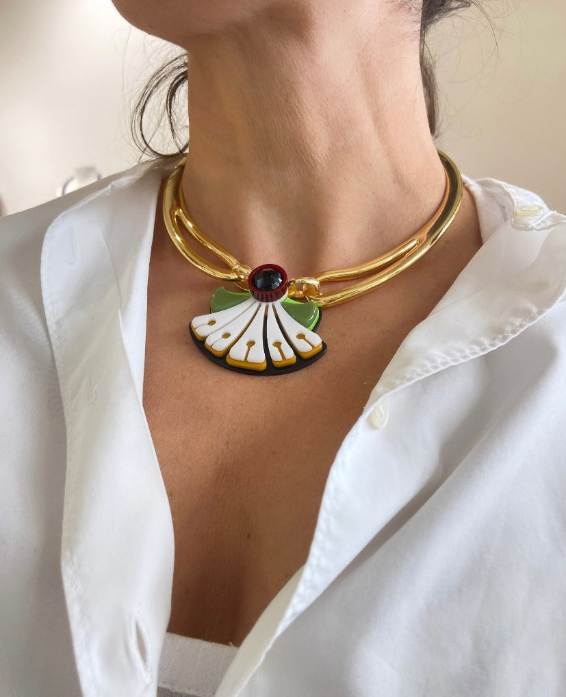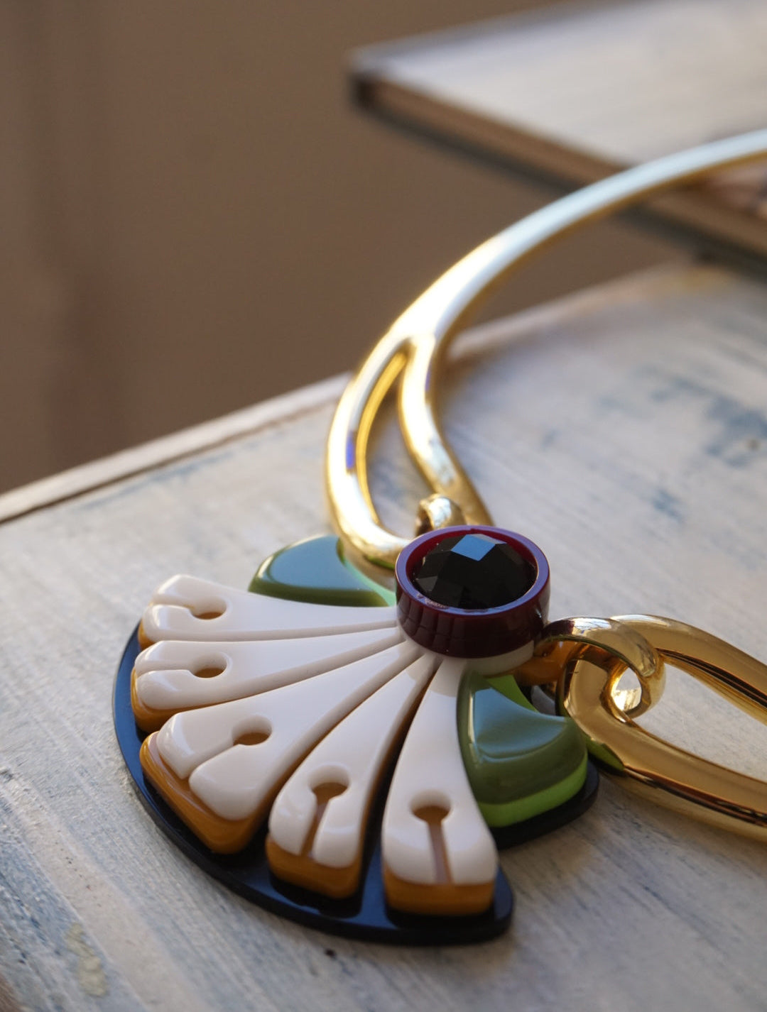 Collana realizzata artigianalmente in Brasile con lastre in acrilico di prima qualità e ad alta densità cromatica.