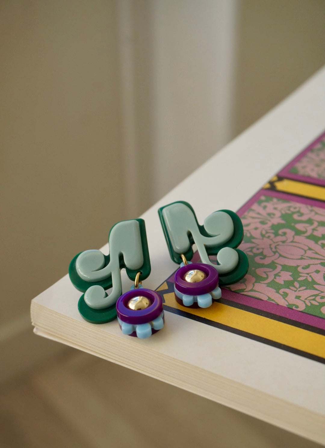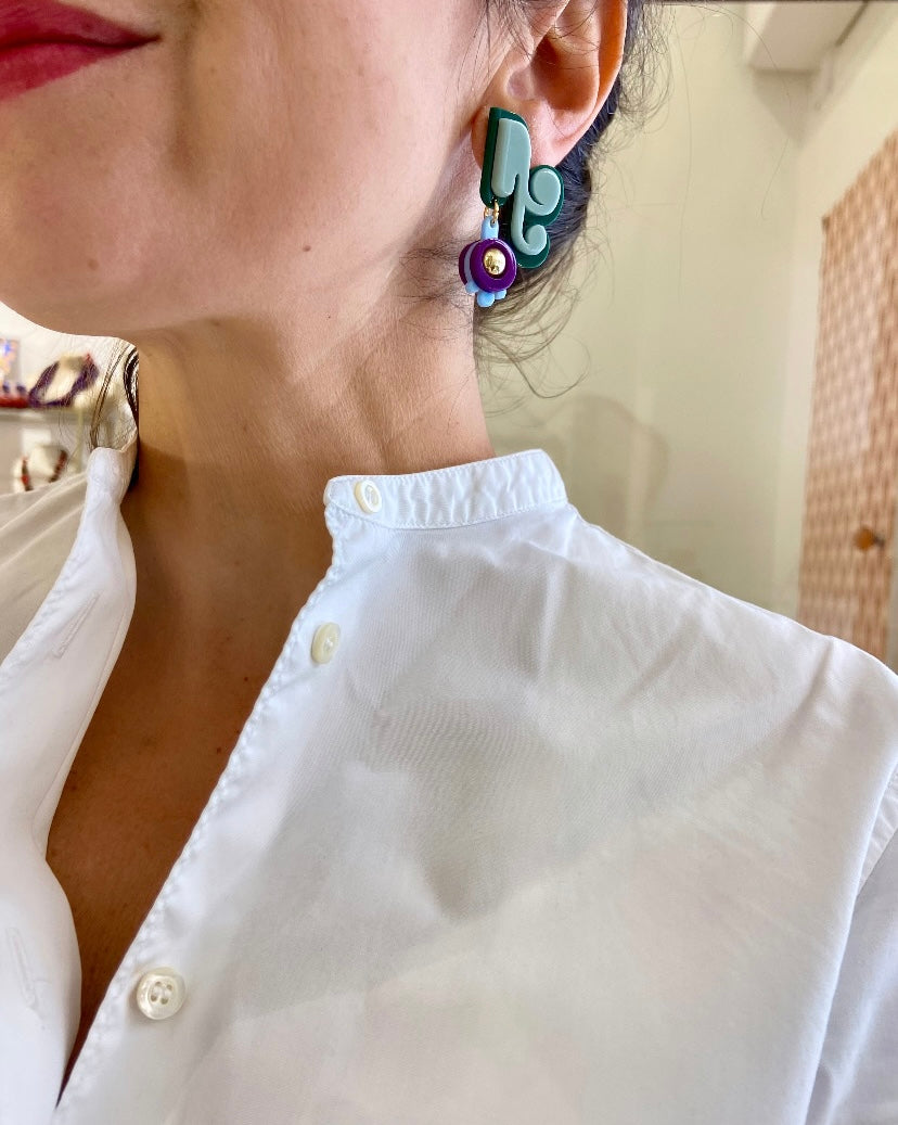 Orecchini realizzati artigianalmente in Brasile con lastre in acrilico di prima qualità e ad alta densità cromatica. Con perno anallergico.