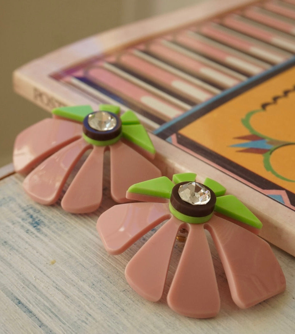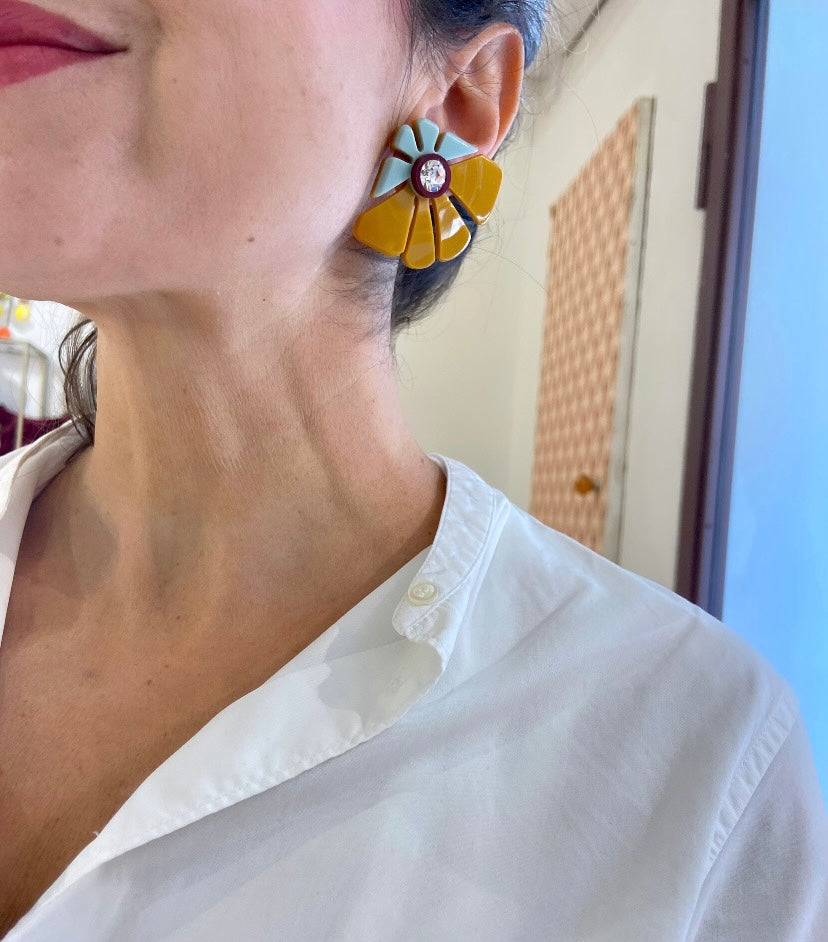 Orecchini realizzati artigianalmente in Brasile con lastre in acrilico di prima qualità e ad alta densità cromatica. Con perno anallergico.