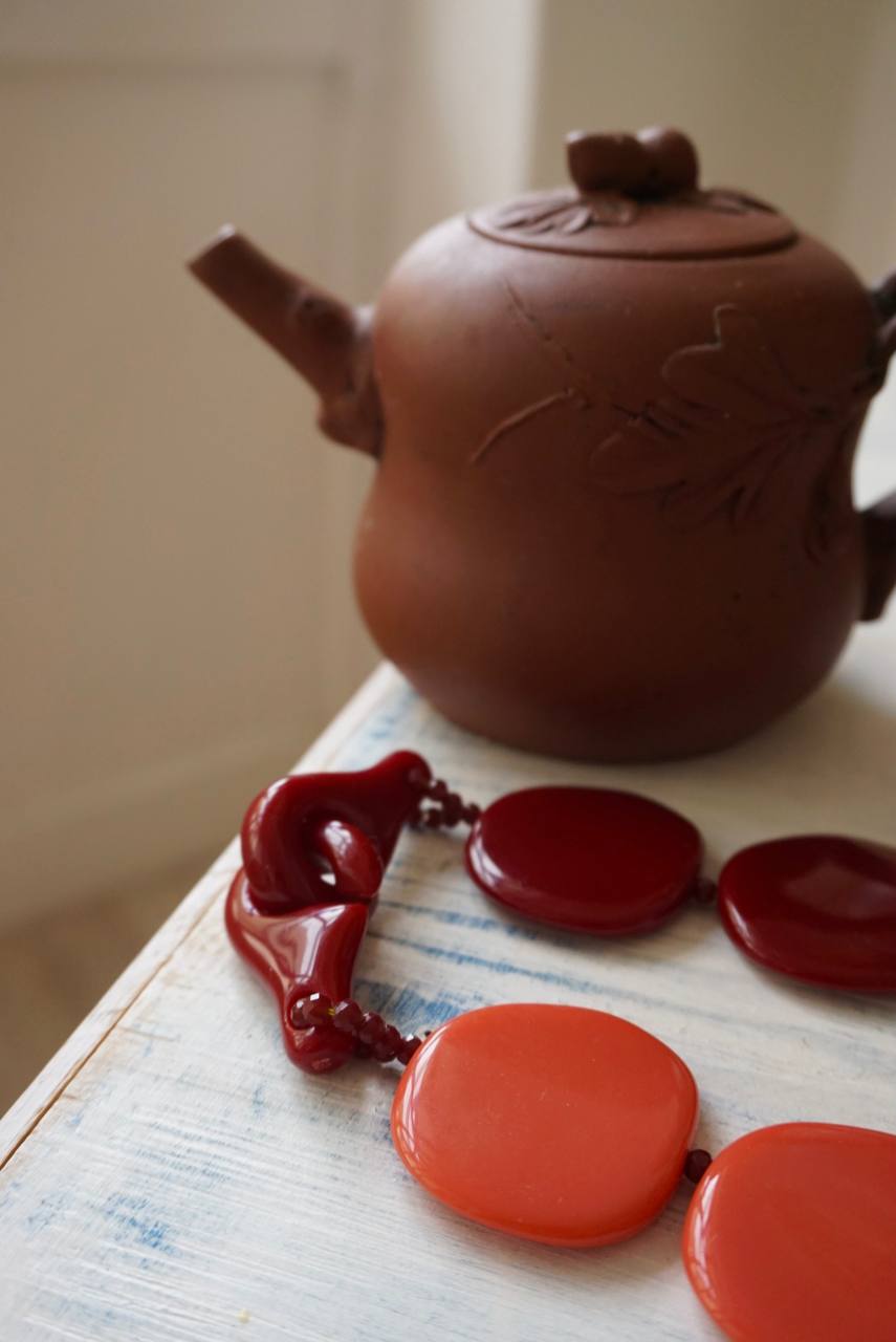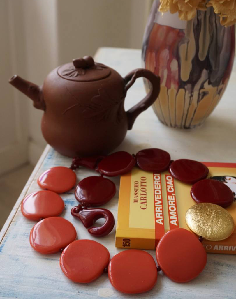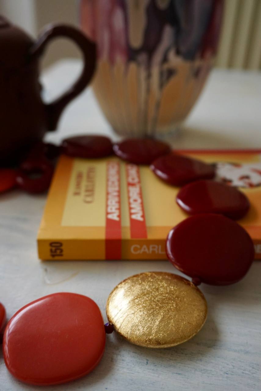 Girocolli realizzati artigianalmente da noi con resine italiane ed elementi in papier maché e foglia oro. Chiusura con moschettone.