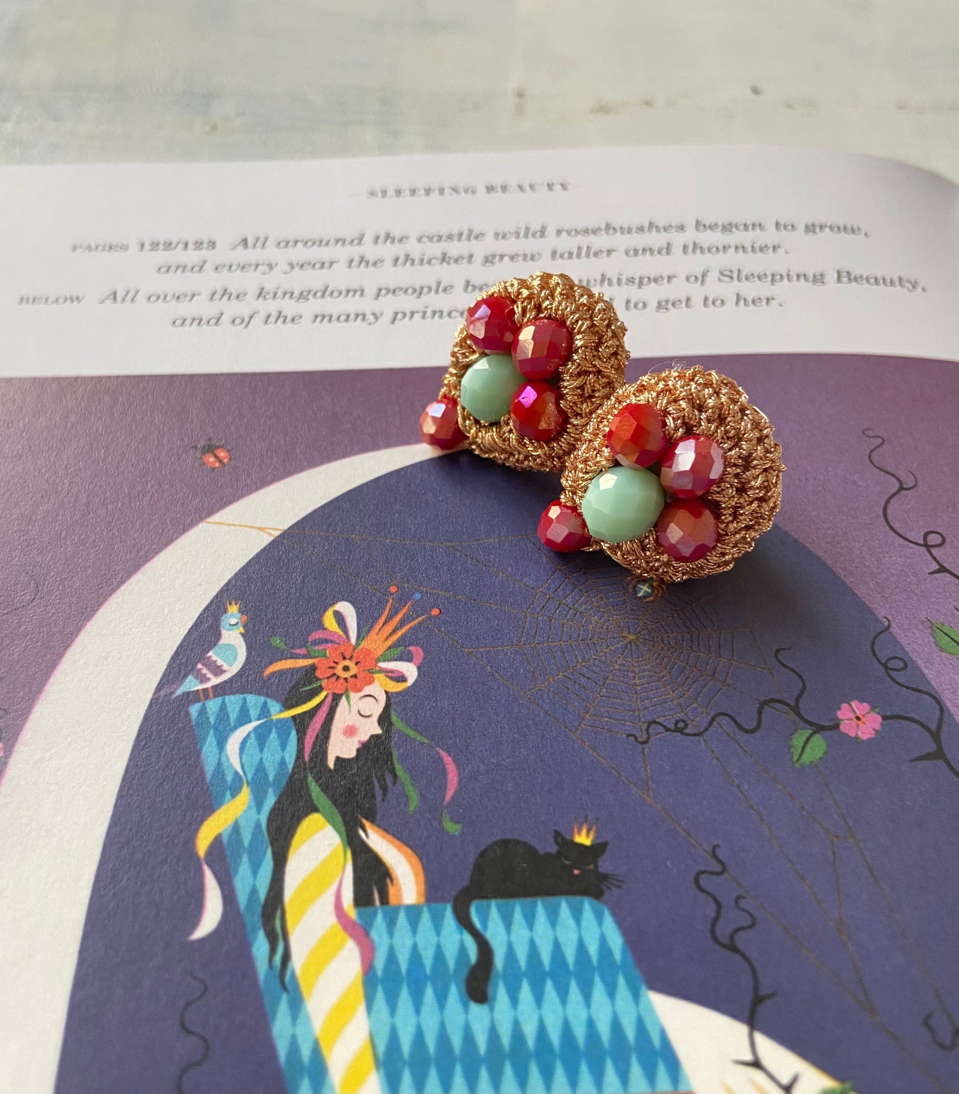 Orecchini con perno, realizzati artigianalmente con filato gioiello in viscosa lamè, nickel free.