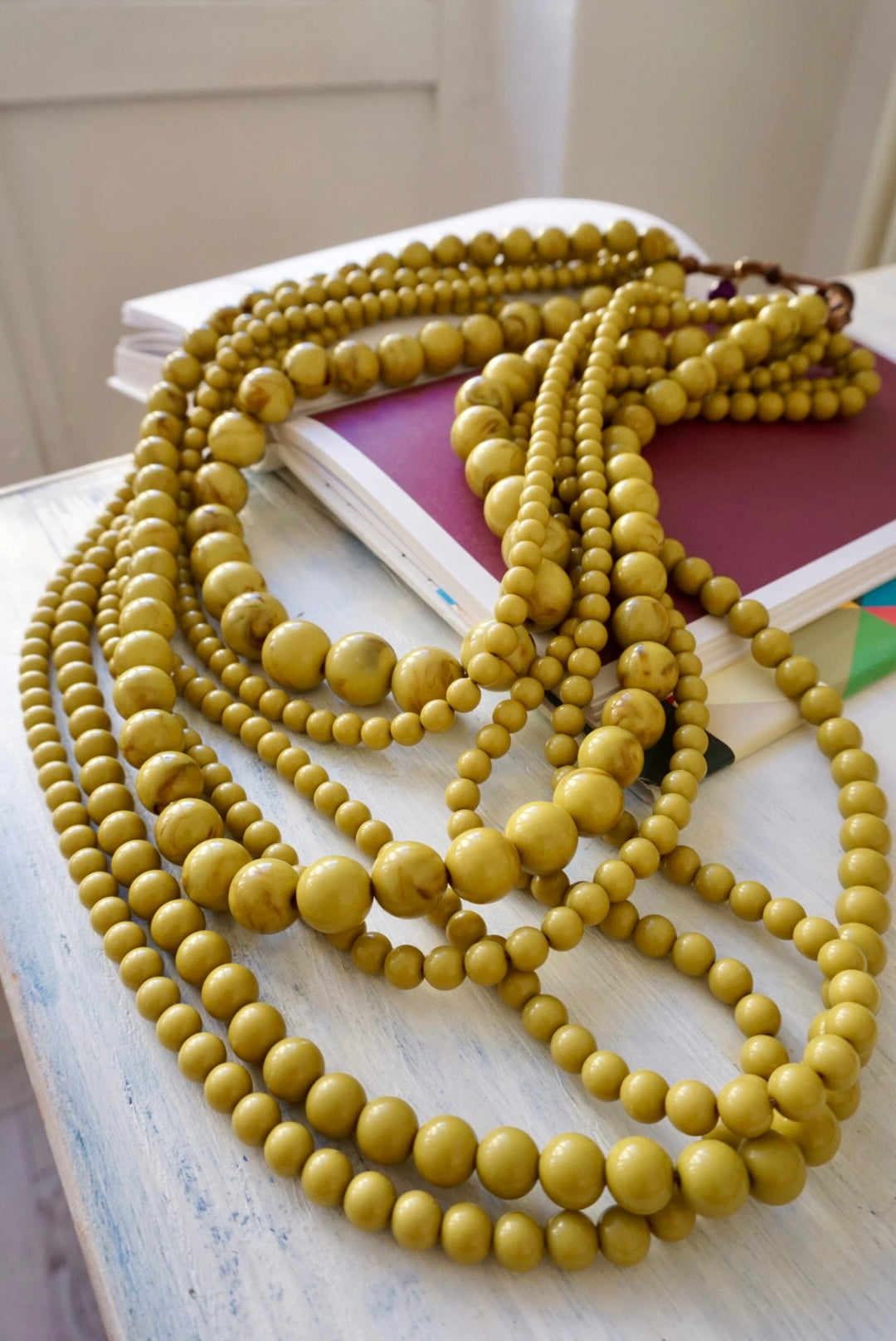 Collana lunga a 7 fili con elementi in resina di 4 diversi diametri e due scalature di colore.