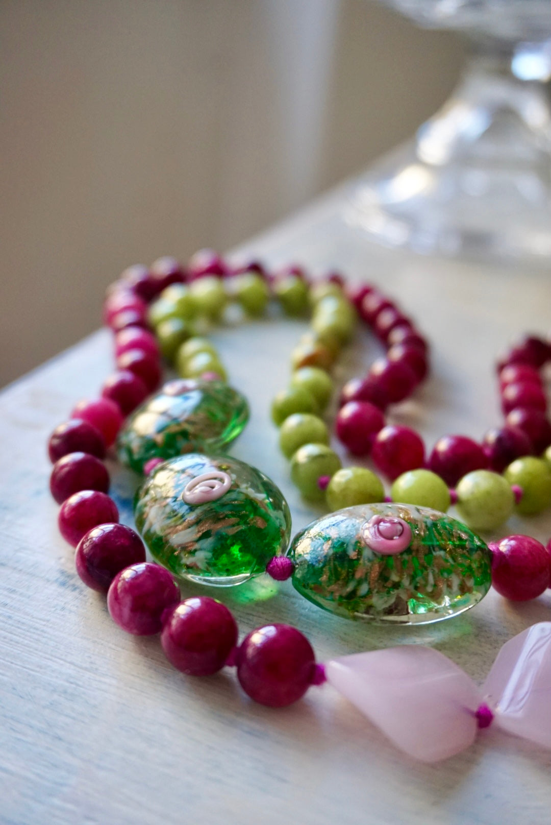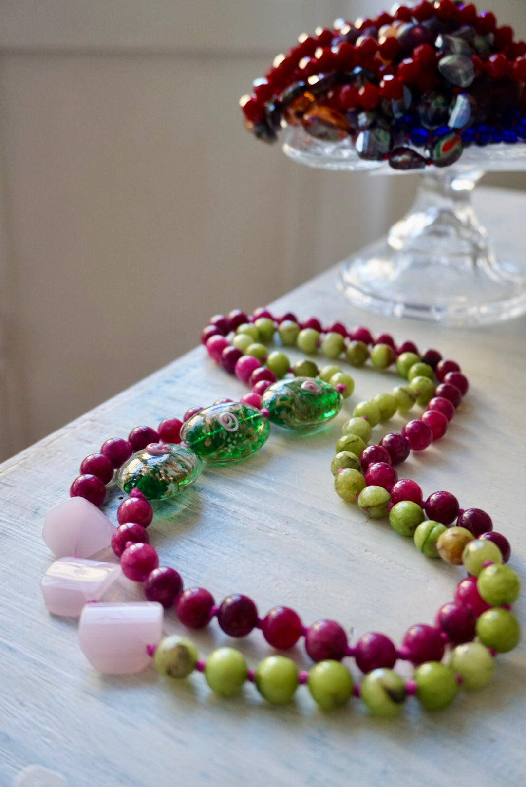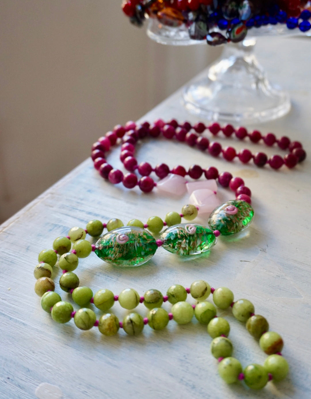 Collane lunghe realizzate dalla nostra fantastica infilatrice con una magica alternanza di cristalli, vetri, pietre dure e nodini colorati. Da poter indossare anche corte, girate due volte!