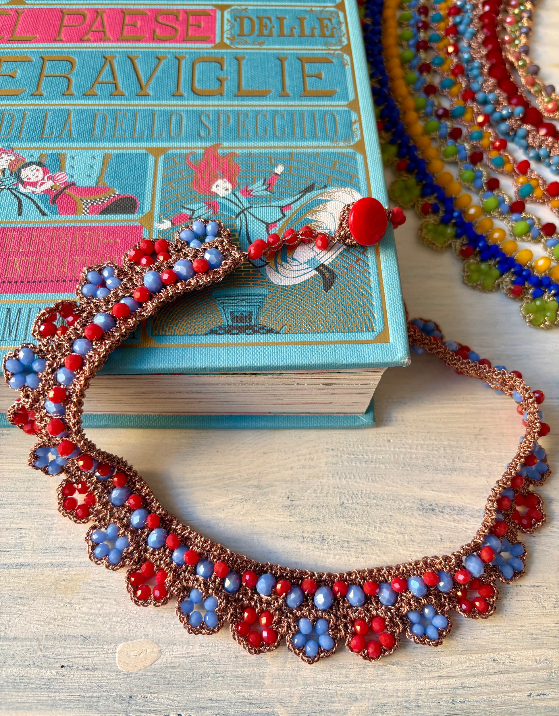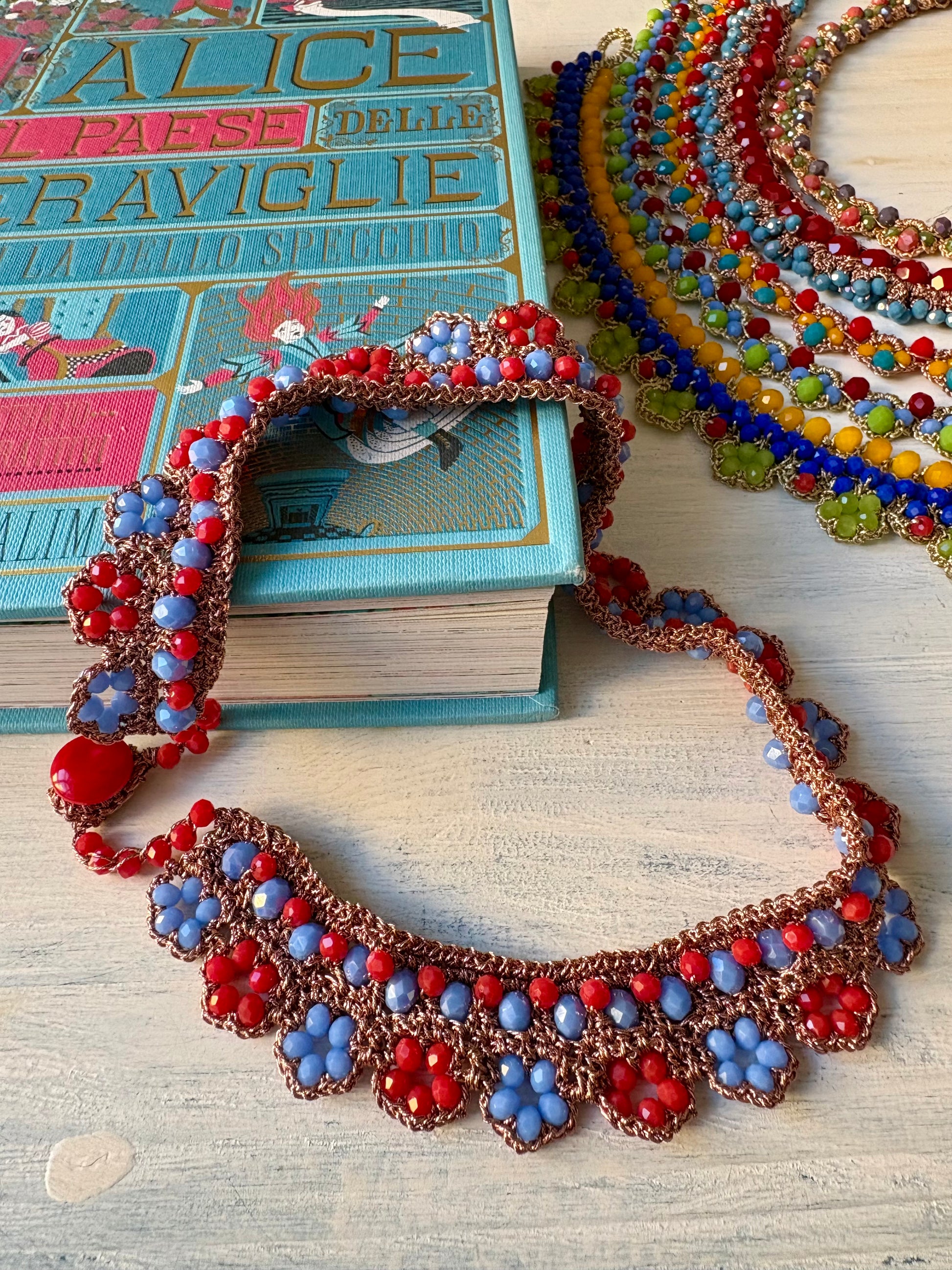 La lavorazione ad uncinetto include vetri, resine e cristalli in un mix di colori sorprendente.