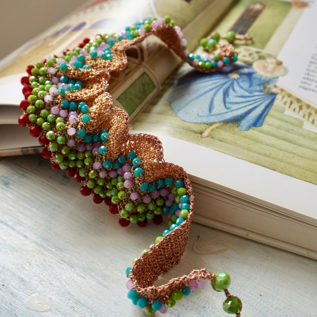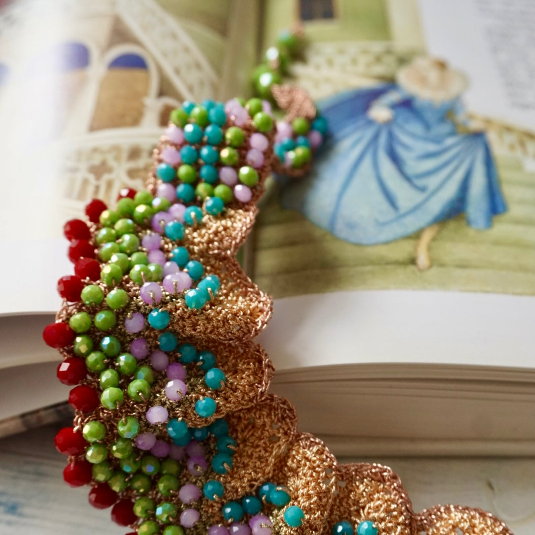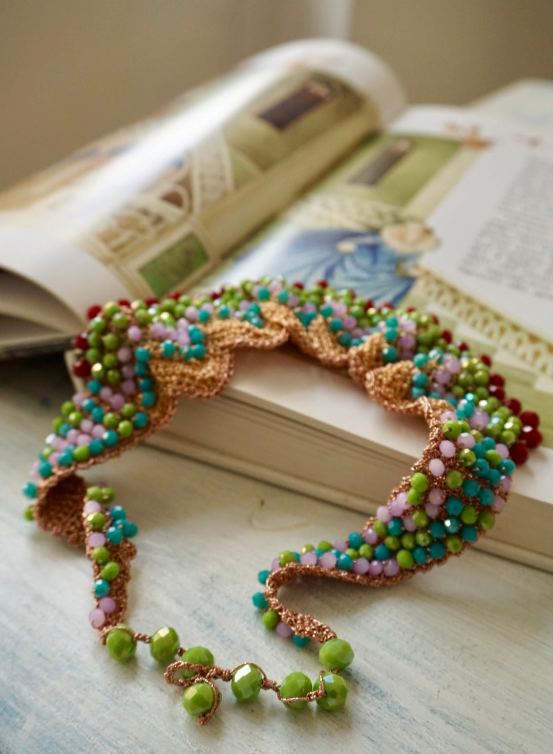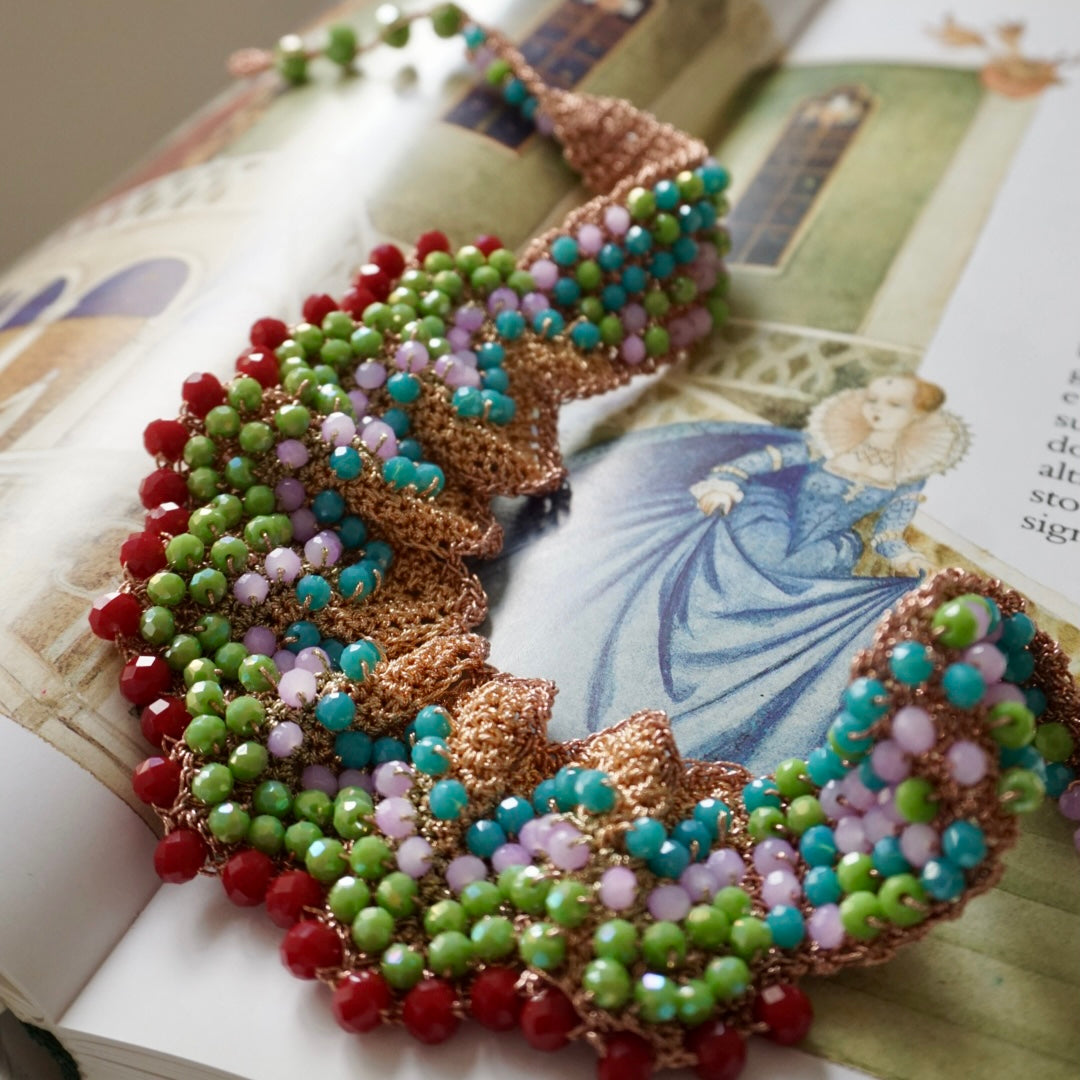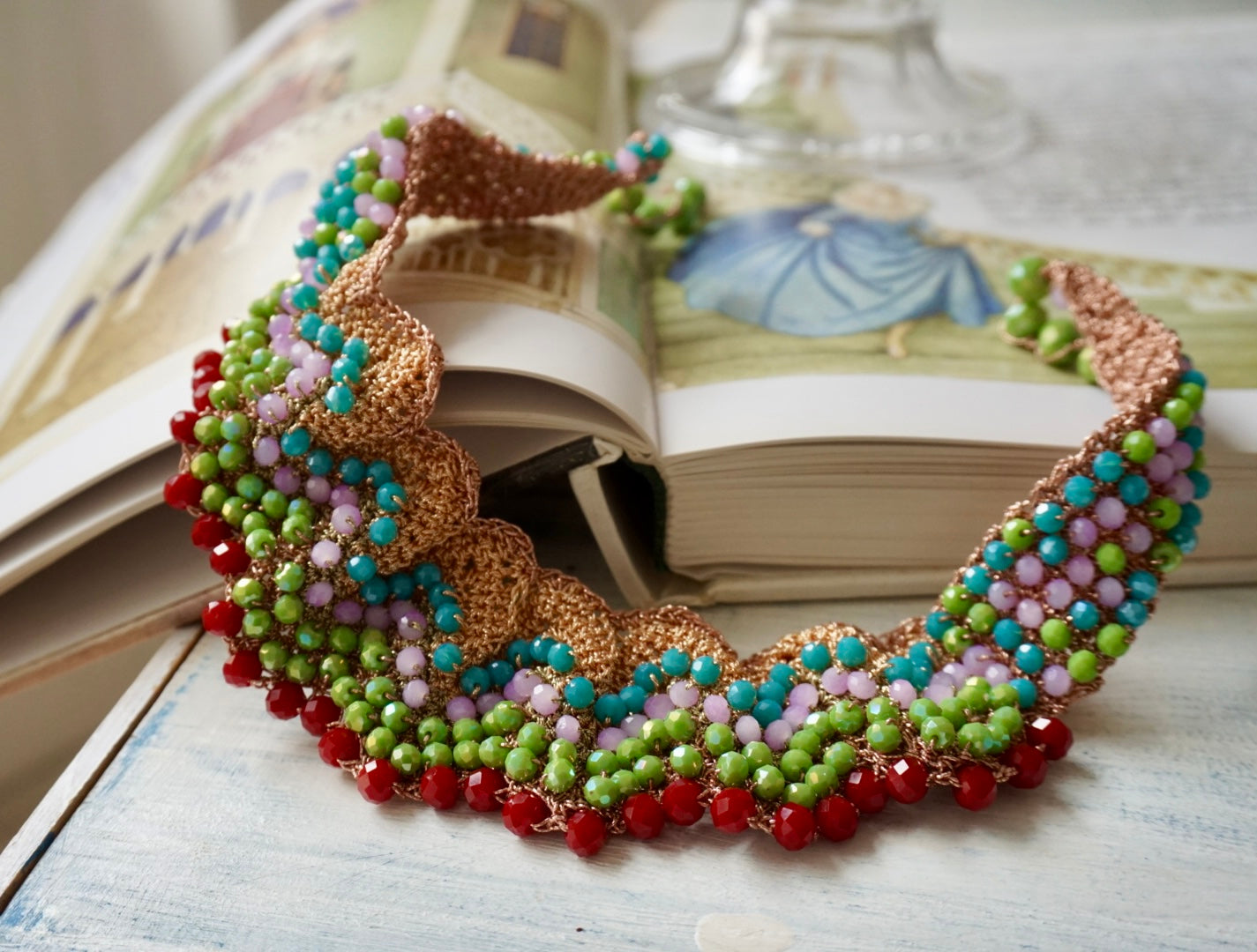 La lavorazione ad uncinetto include vetri, resine e cristalli in un mix di colori sorprendente.
