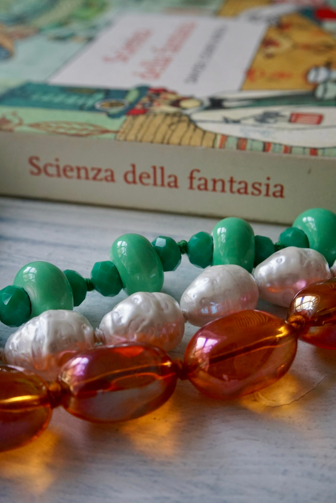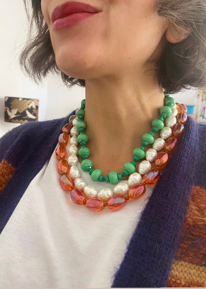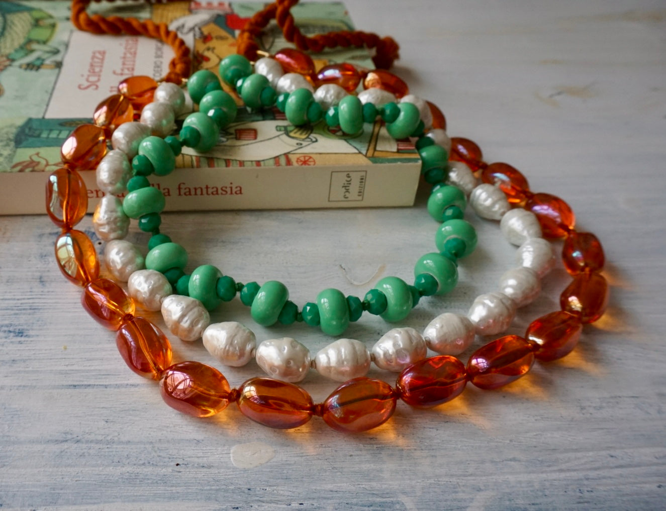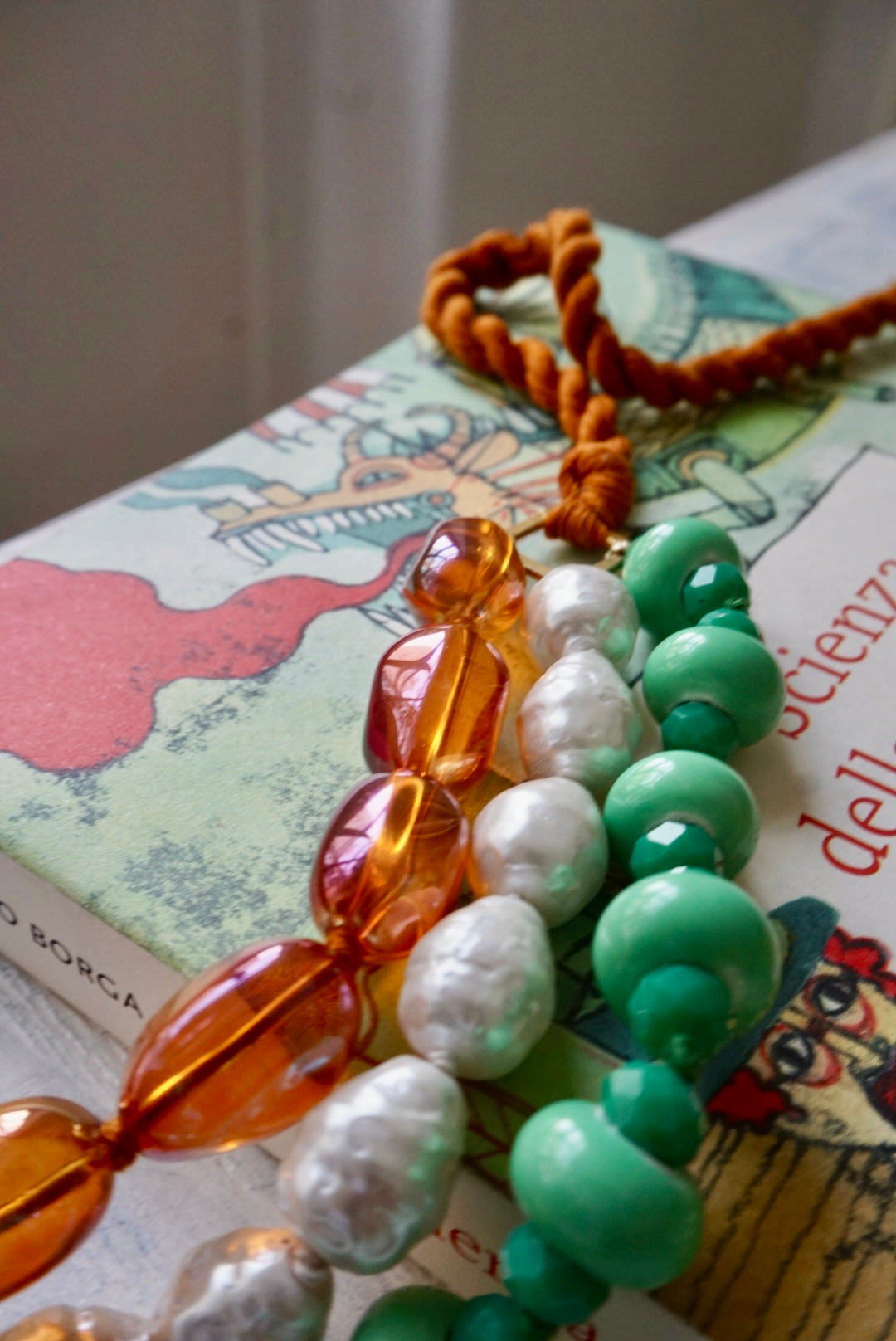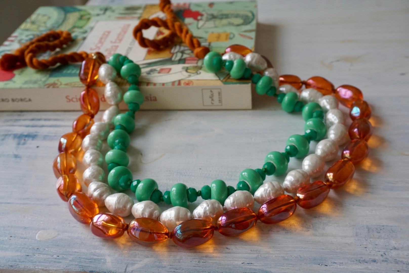 Girocollo a tre giri con pepite in vetro color miele di castagno, perle in pasta di vetro “baroccate”, ceramica e cristalli verde menta. Chiusura realizzata con cordone artigianale che permette di regolare leggermente la lunghezza della collana.