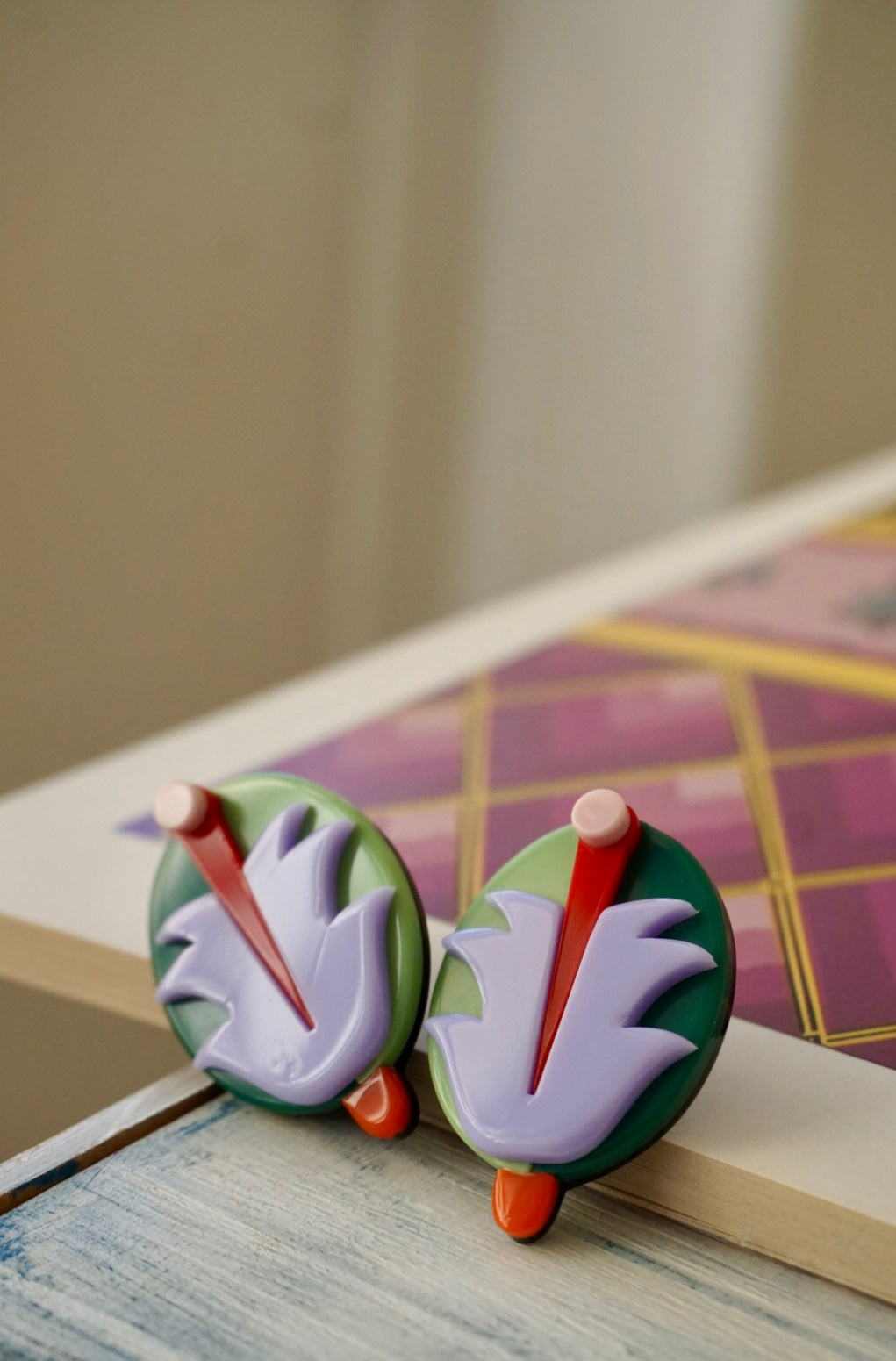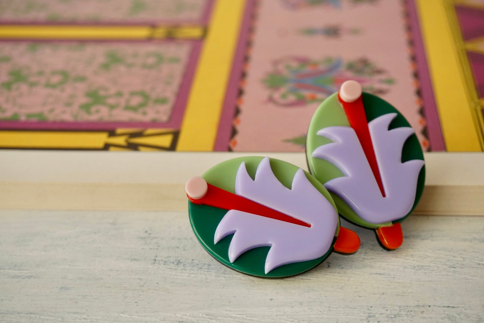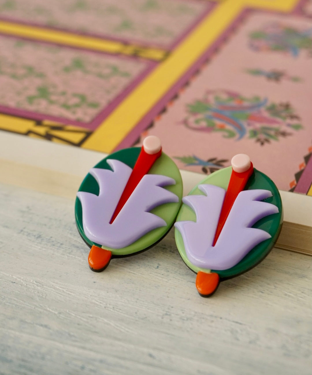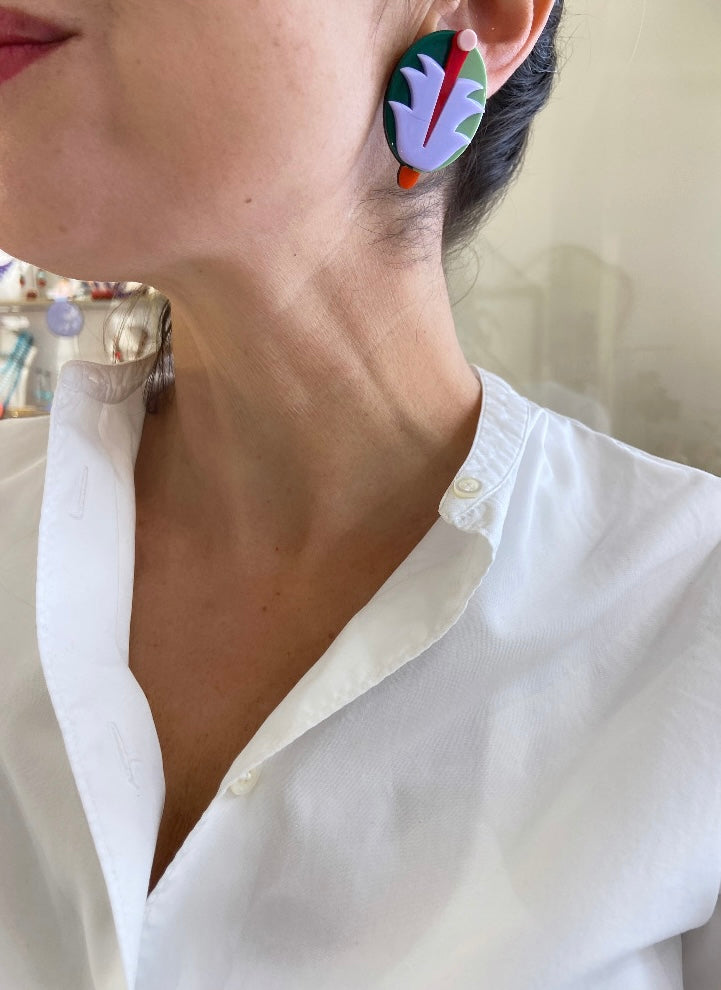 Orecchini realizzati artigianalmente in Brasile con lastre in acrilico di prima qualità e ad alta densità cromatica. Con perno anallergico.