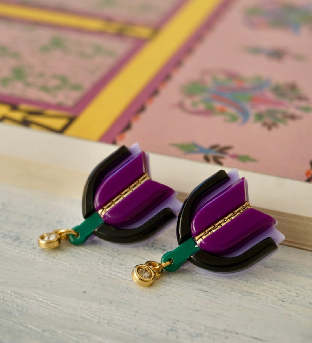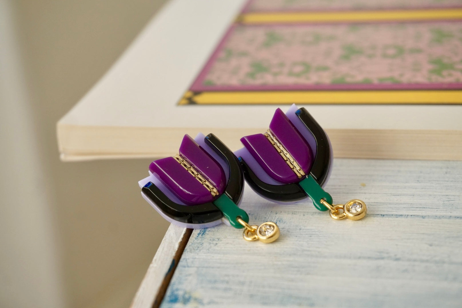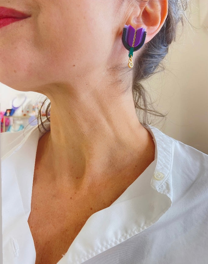 Orecchini realizzati artigianalmente in Brasile con lastre in acrilico di prima qualità e ad alta densità cromatica. Con perno anallergico.