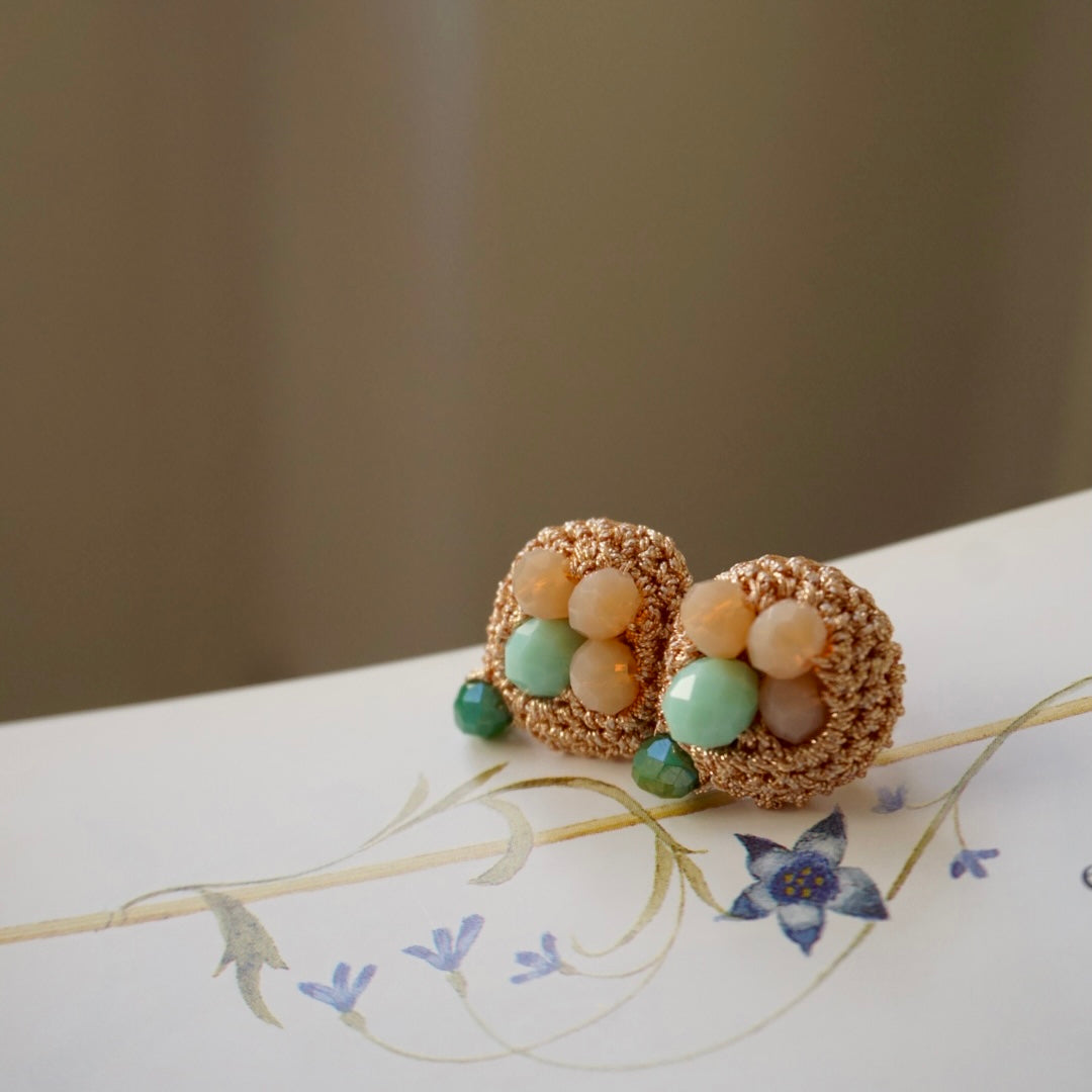 Orecchini con perno, realizzati artigianalmente con filato gioiello in viscosa lamè, nickel free.
